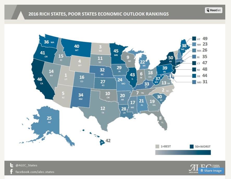 The American Legislative Exchange Council weighs all fifty states based on diverse outcomes including taxes, labor laws, and regulatory schemas.