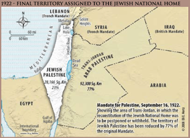In 1922, Britain issued a memorandum excluding the area east of the Jordan River – about 77% of the Mandate territory – from Jewish settlements.